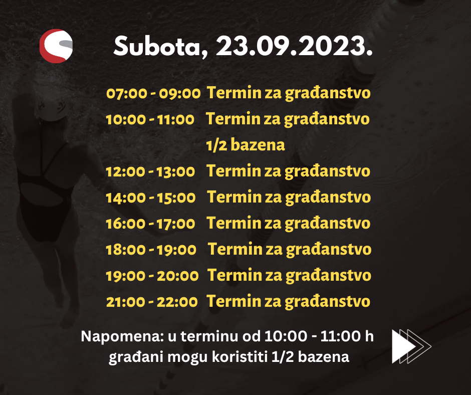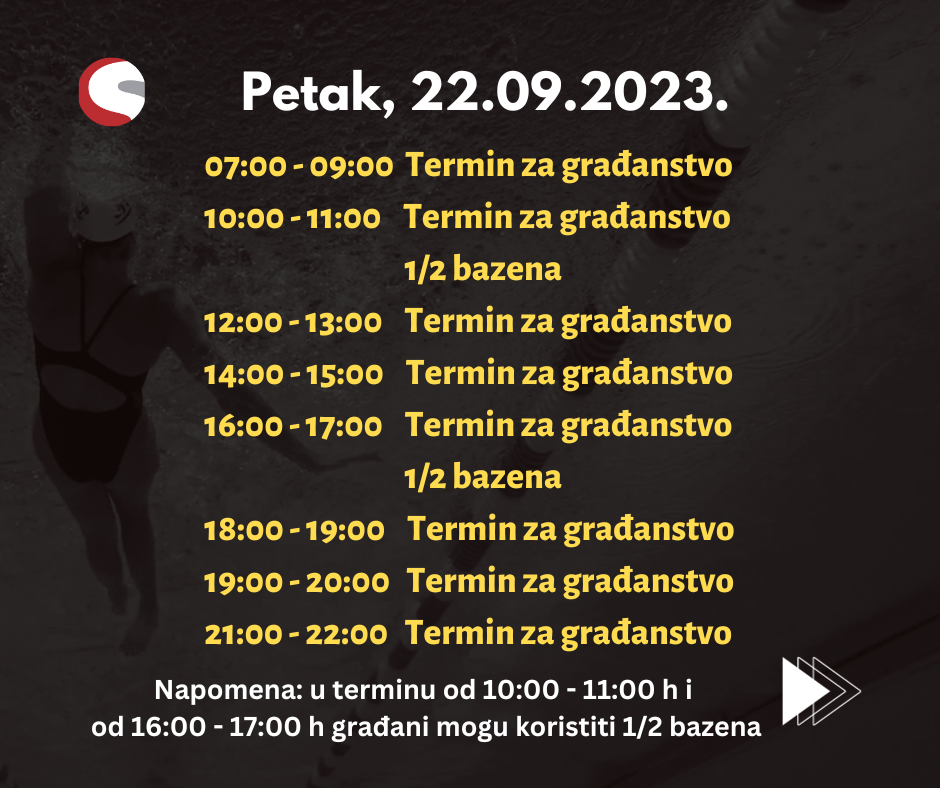 RASPORED TERMINA NA BAZENU OD 18.09.2023. – 25.09.2023. 17. septembra 2023. by Sportski Centar Posted in:Obavještenja See more Prev:RASPORED TERMINA NA BAZENU OD 11.09.2023. – 18.09.2023. Back: Svi članci Next:ŠKOLA PLIVANJA JP SPORTSKI CENTAR NIKŠIĆ