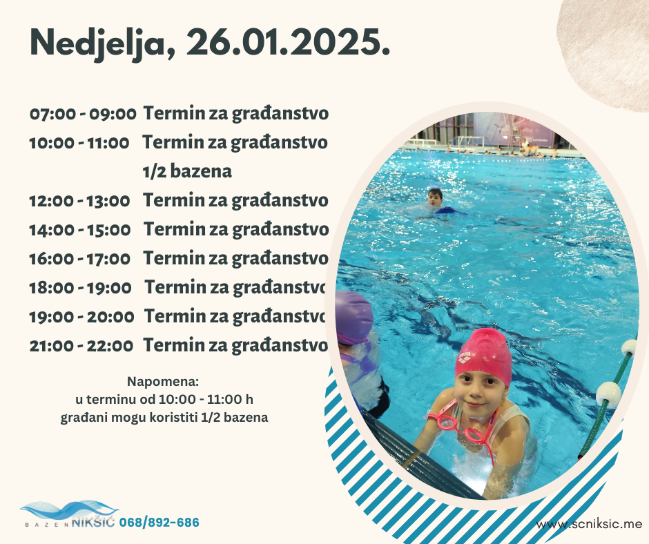 RASPORED TERMINA NA BAZENU OD 20.01.2025. – 27.01.2025. 18. januara 2025. by Sportski Centar Posted in:Obavještenja See more Prev:RASPORED TERMINA NA BAZENU OD 13.01.2025. – 20.01.2025. Back: Svi članci Next:Ugovor o pruzanju internet usluga