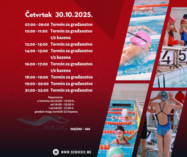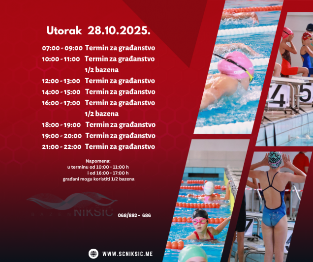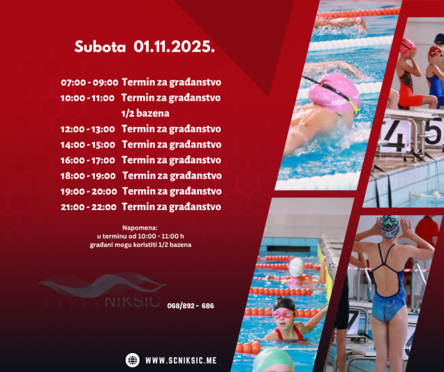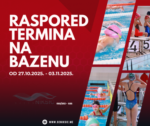 RASPORED TERMINA NA BAZENU OD 27.10.2025. – 03.11.2025. 26. oktobra 2025. by Sportski Centar Posted in:Obavještenja See more Prev:RASPORED TERMINA NA BAZENU OD 20.10.2025. – 27.10.2025. Back: Svi članci