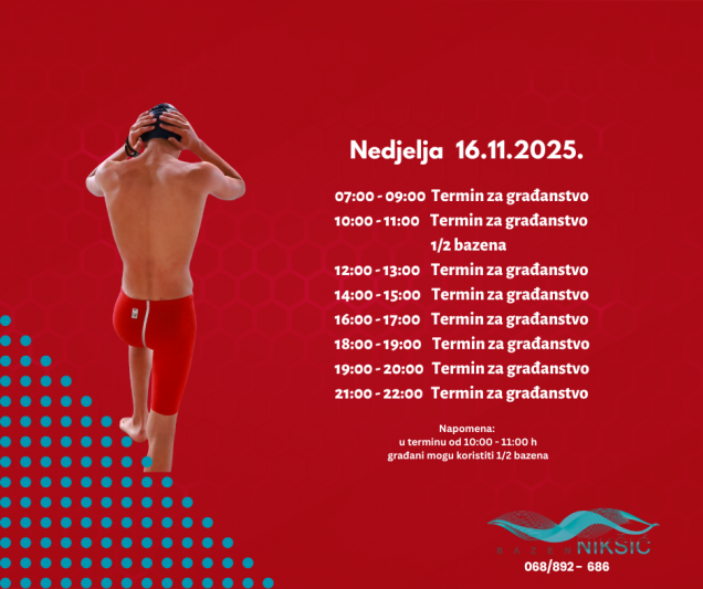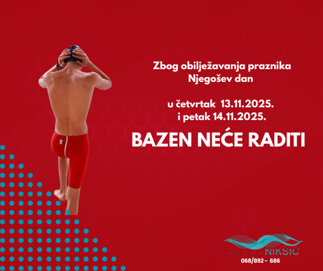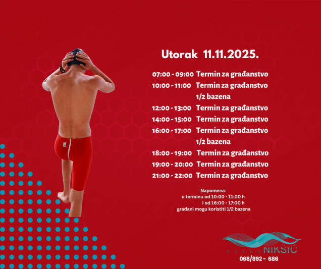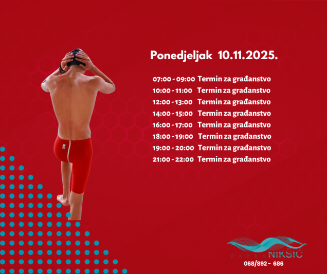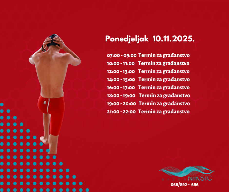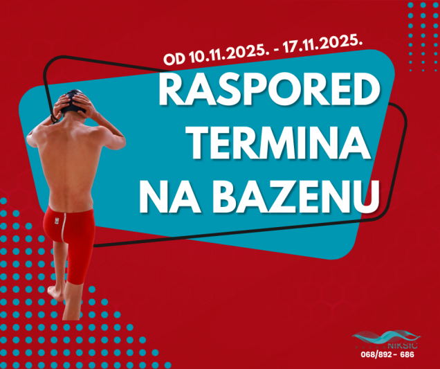 RASPORED TERMINA NA BAZENU OD 10.11.2025. – 17.11.2025. 8. novembra 2025. by Sportski Centar Posted in:Obavještenja See more Prev:RASPORED TERMINA NA BAZENU OD 03.11.2025. – 10.11.2025. Back: Svi članci