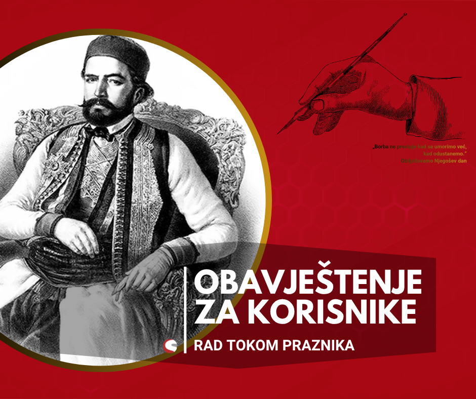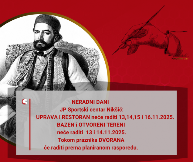 OBAVJEŠTENJE ZA KORISNIKE – RAD TOKOM PRAZNIKA – NJEGOŠEV DAN 12. novembra 2025. by Sportski Centar Posted in:Obavještenja See more Prev:RASPORED TERMINA NA BAZENU OD 10.11.2025. – 17.11.2025. Back: Svi članci