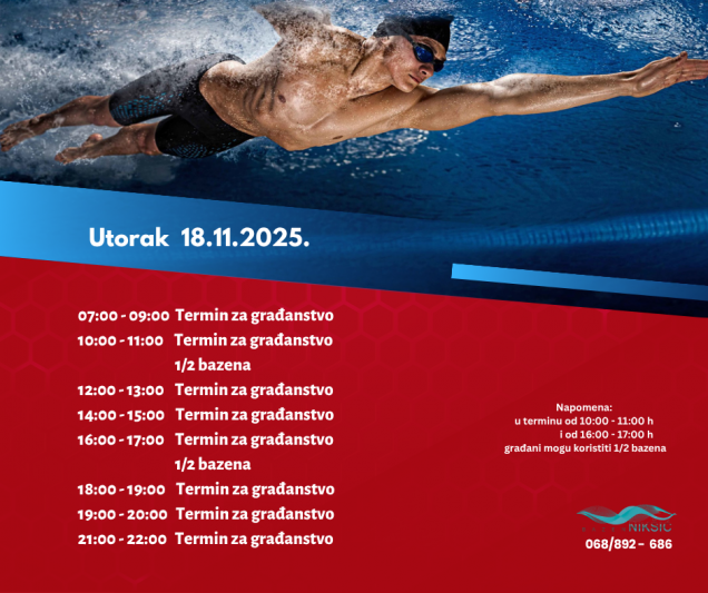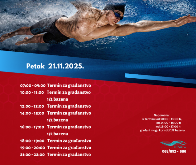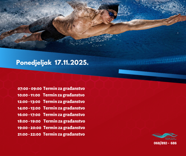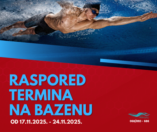 RASPORED TERMINA NA BAZENU OD 17.11.2025. – 24.11.2025. 15. novembra 2025. by Sportski Centar Posted in:Obavještenja See more Prev:OBAVJEŠTENJE ZA KORISNIKE – RAD TOKOM PRAZNIKA – NJEGOŠEV DAN Back: Svi članci