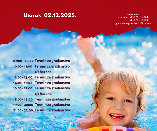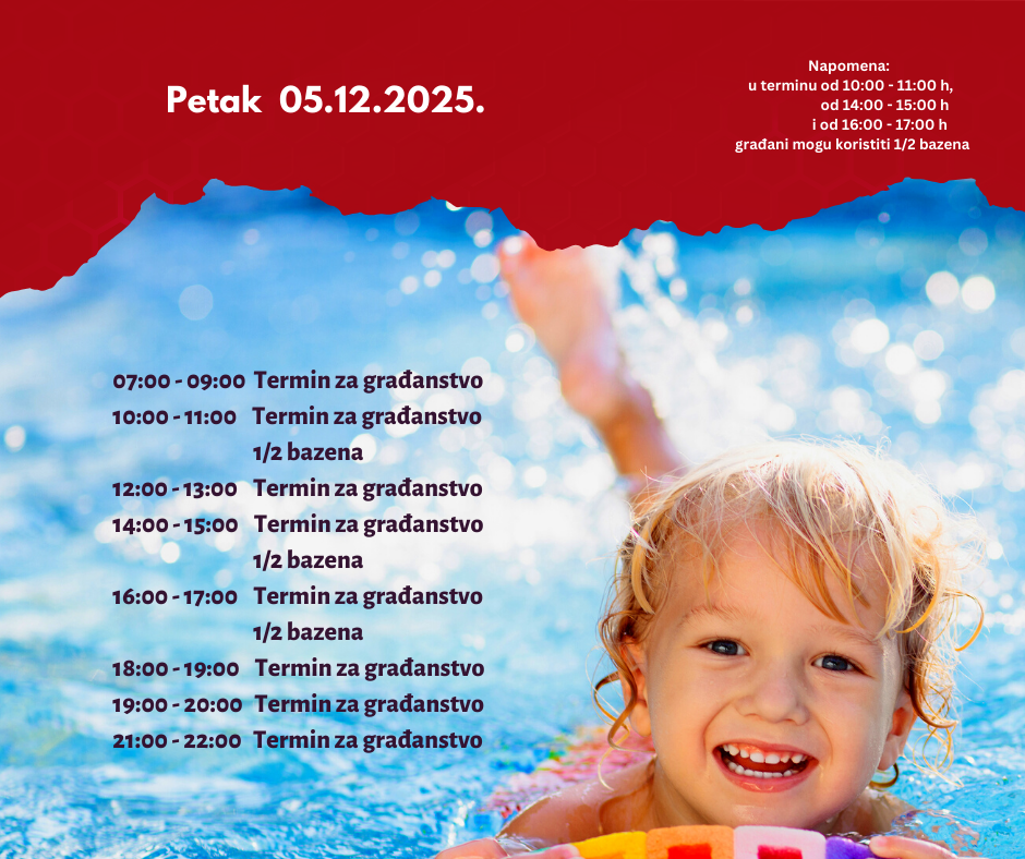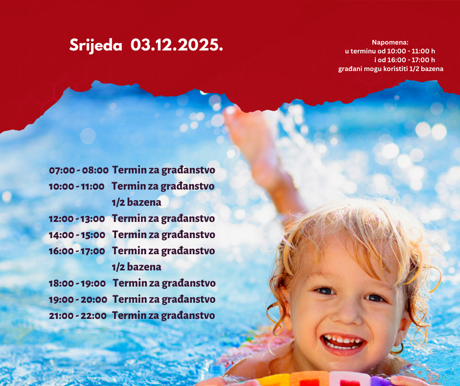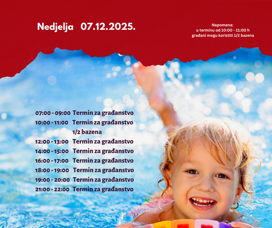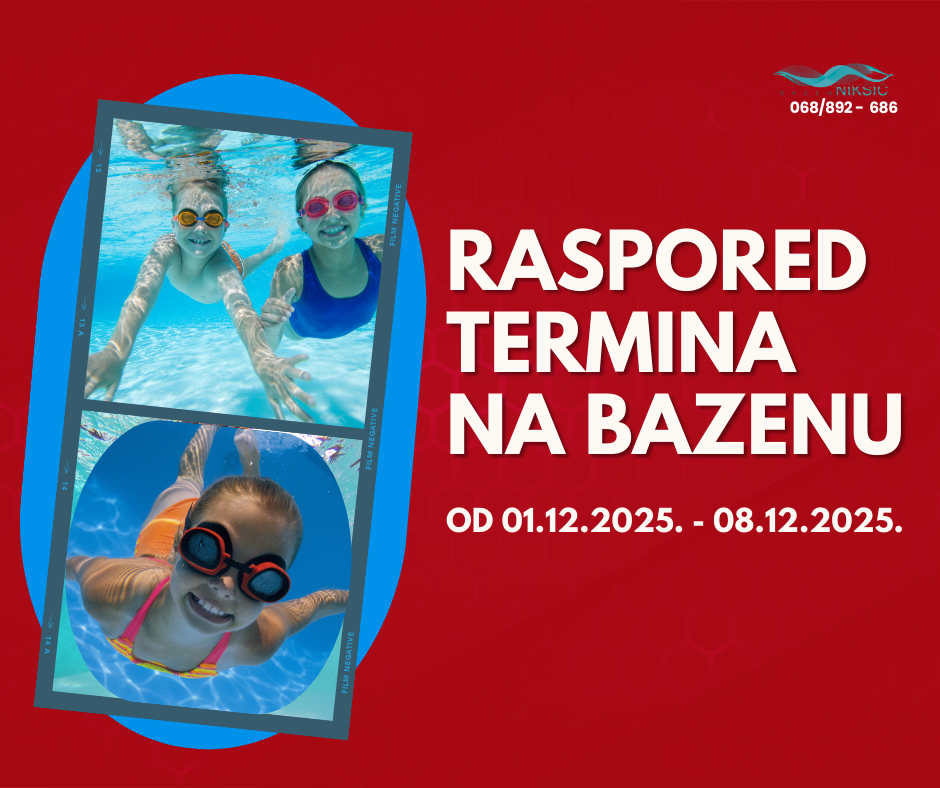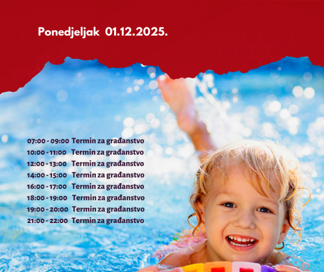 RASPORED TERMINA NA BAZENU OD 01.12.2025. – 08.12.2025. 29. novembra 2025. by Sportski Centar Posted in:Obavještenja See more Prev:RASPORED TERMINA NA BAZENU OD 24.11.2025. – 01.12.2025. Back: Svi članci