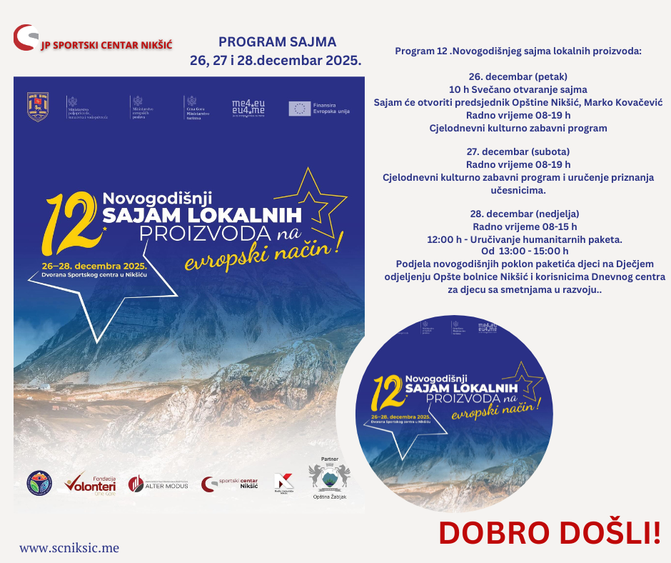 12 NOVOGODIŠNJI SAJAM LOKALNIH PROIZVODA 25. decembra 2025. by Sportski Centar Posted in:Obavještenja See more Prev:RASPORED TERMINA NA BAZENU OD 22.12.2025. – 29.12.2025. Back: Svi članci