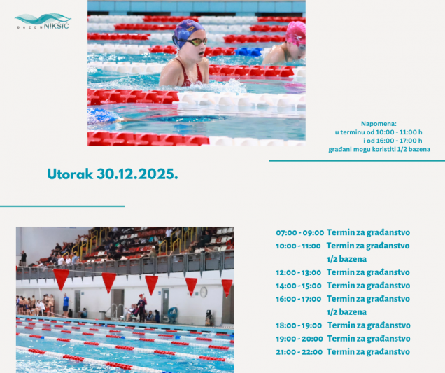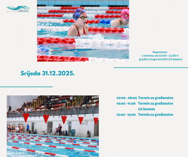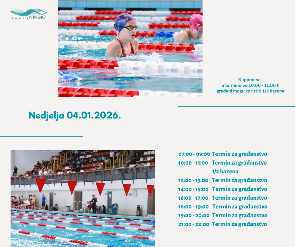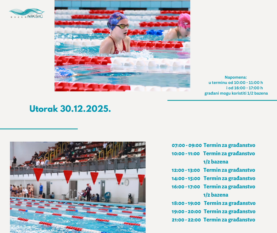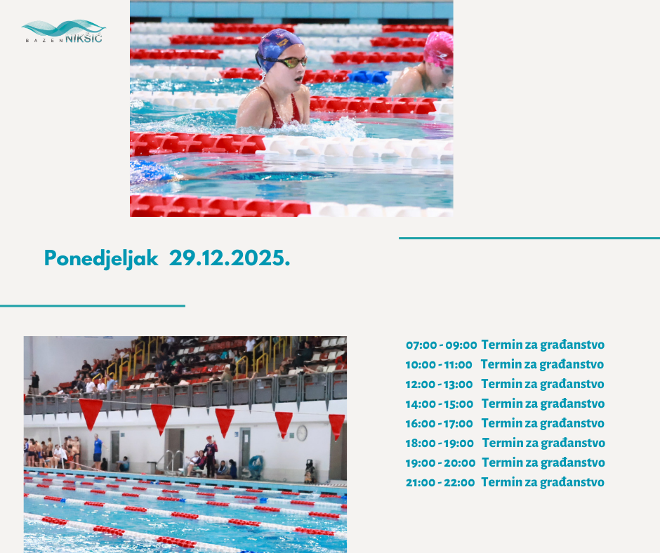 RASPORED TERMINA NA BAZENU OD 29.12.2025. – 05.01.2026. 27. decembra 2025. by Sportski Centar Posted in:Obavještenja See more Prev:12 NOVOGODIŠNJI SAJAM LOKALNIH PROIZVODA Back: Svi članci