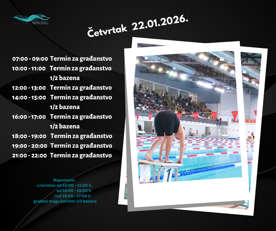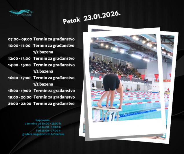 RASPORED TERMINA NA BAZENU OD 19.01.2026. – 26.01.2026. 17. januara 2026. by Sportski Centar Posted in:Obavještenja See more Prev:RASPORED TERMINA NA BAZENU OD 12.01.2026. – 19.01.2026. Back: Svi članci