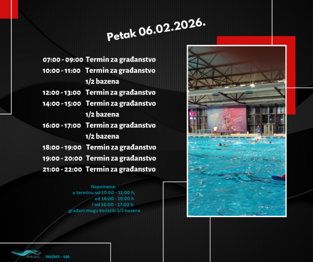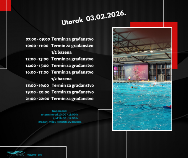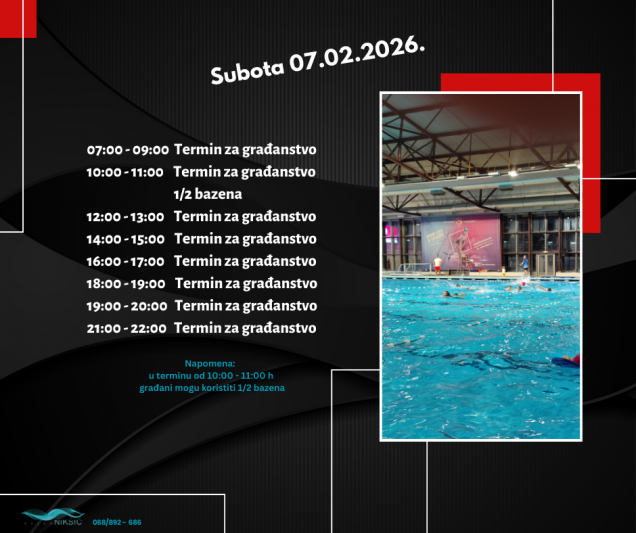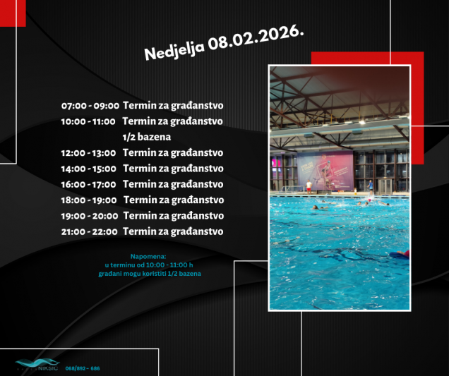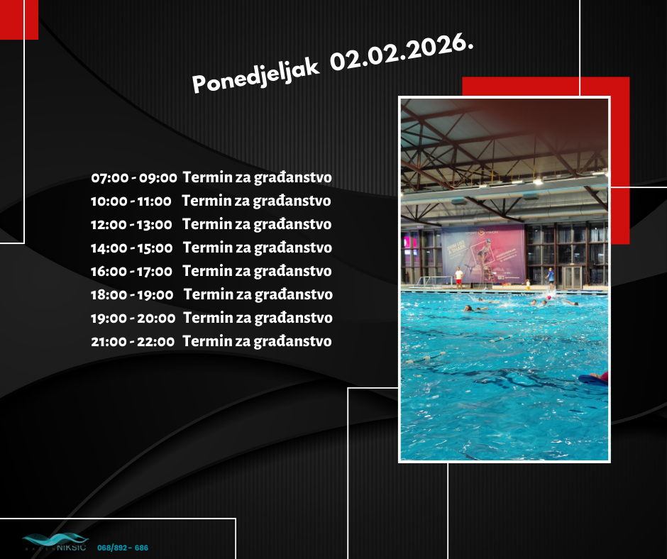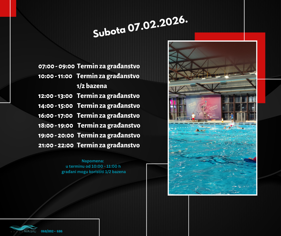 RASPORED TERMINA NA BAZENU OD 02.02.2026. – 09.02.2026. 31. januara 2026. by Sportski Centar Posted in:Obavještenja See more Prev:RASPORED TERMINA NA BAZENU OD 26.01.2026. – 02.02.2026. Back: Svi članci